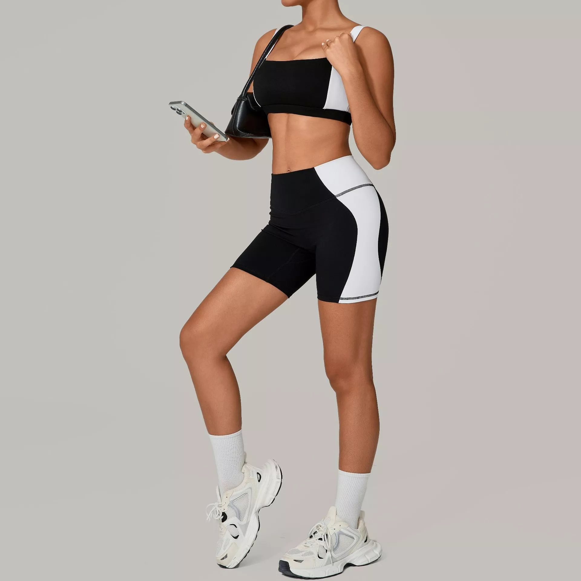 2PCS Color Block Yoga Set with Sports Bra and High Waist Workout Shorts