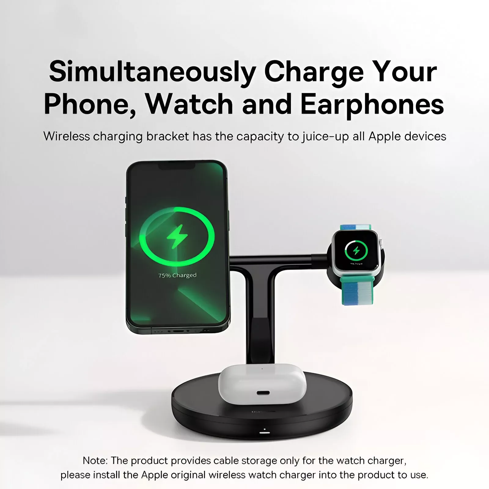 Say goodbye to messy cables and charge all your essentials in one sleek station. This 3-in-1 magnetic wireless charging stand is designed for iPhone, Apple Watch, and AirPods, keeping your setup clean, organized, and efficient. With precise magnetic alignment and powerful suction, your devices snap perfectly into place for safe and fast charging every time.