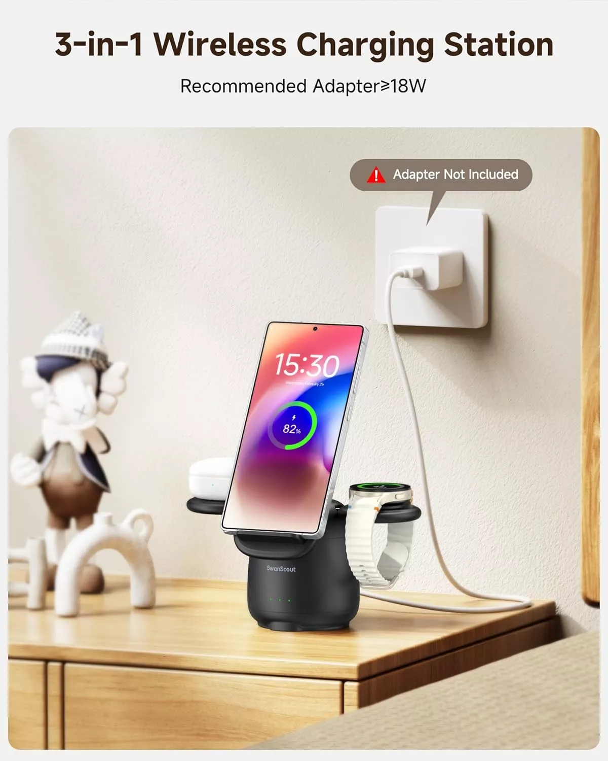 • 3-in-1 Design: Charge your phone, smartwatch, and earbuds all at the same time.