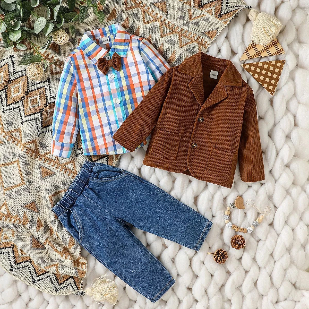Give your baby boy the perfect mix of comfort and charm with this 3-piece outfit set. Designed with care, it includes a warm brown coat, a stylish plaid long-sleeve shirt, and classic blue jeans — everything your little one needs to look smart while staying comfortable. Perfect for boys aged 6 months to 3 years, this set is ideal for everyday adventures, family outings, or those special photo-worthy moments.