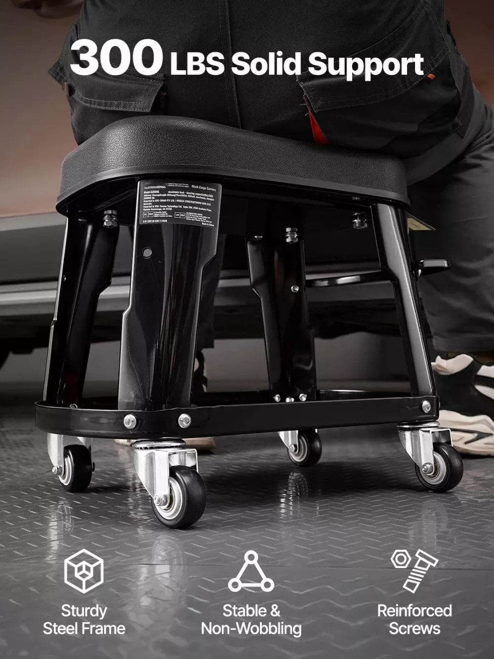 Upgrade your garage or workshop experience with this versatile mechanic stool. Designed to make repairs, maintenance, and long hours of work easier, this rolling workshop seat keeps you comfortable and upright. No more straining your back or knees while working under cars, on tools, or around your workspace. With a sturdy 300 lbs weight capacity, it’s built to provide reliable support while letting you move freely and work efficiently.