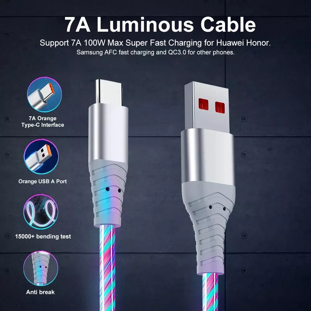 Elevate your charging experience with this 7A 100W flow luminous USB-C cable. Designed for maximum efficiency, it delivers super-fast charging for Huawei, Honor, Xiaomi, Samsung, and other QC3.0 compatible devices. The flowing luminous effect adds a modern, stylish touch, making it not only functional but visually striking while charging. Ideal for busy users who need rapid power and a reliable data connection.