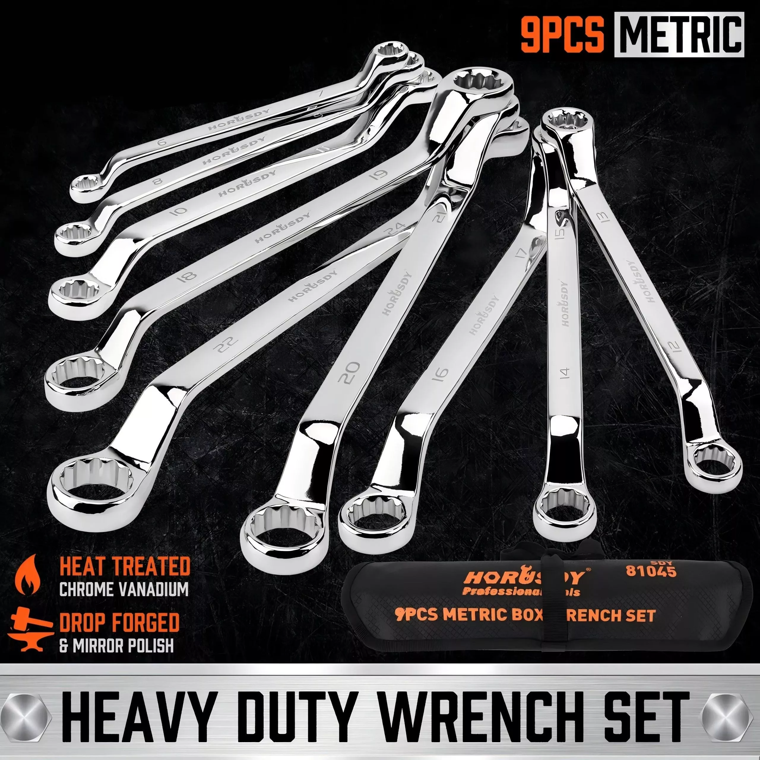 Take on any repair or project with confidence using this 9-piece offset double box end wrench set. Each wrench is crafted from strong chrome vanadium steel, mirror polished for a sleek finish, and chrome plated to resist rust. The heat-treated, drop-forged design delivers long-lasting durability that stands up to heavy use. This is a set built to exceed standards and meet the demands of both professionals and DIYers alike.