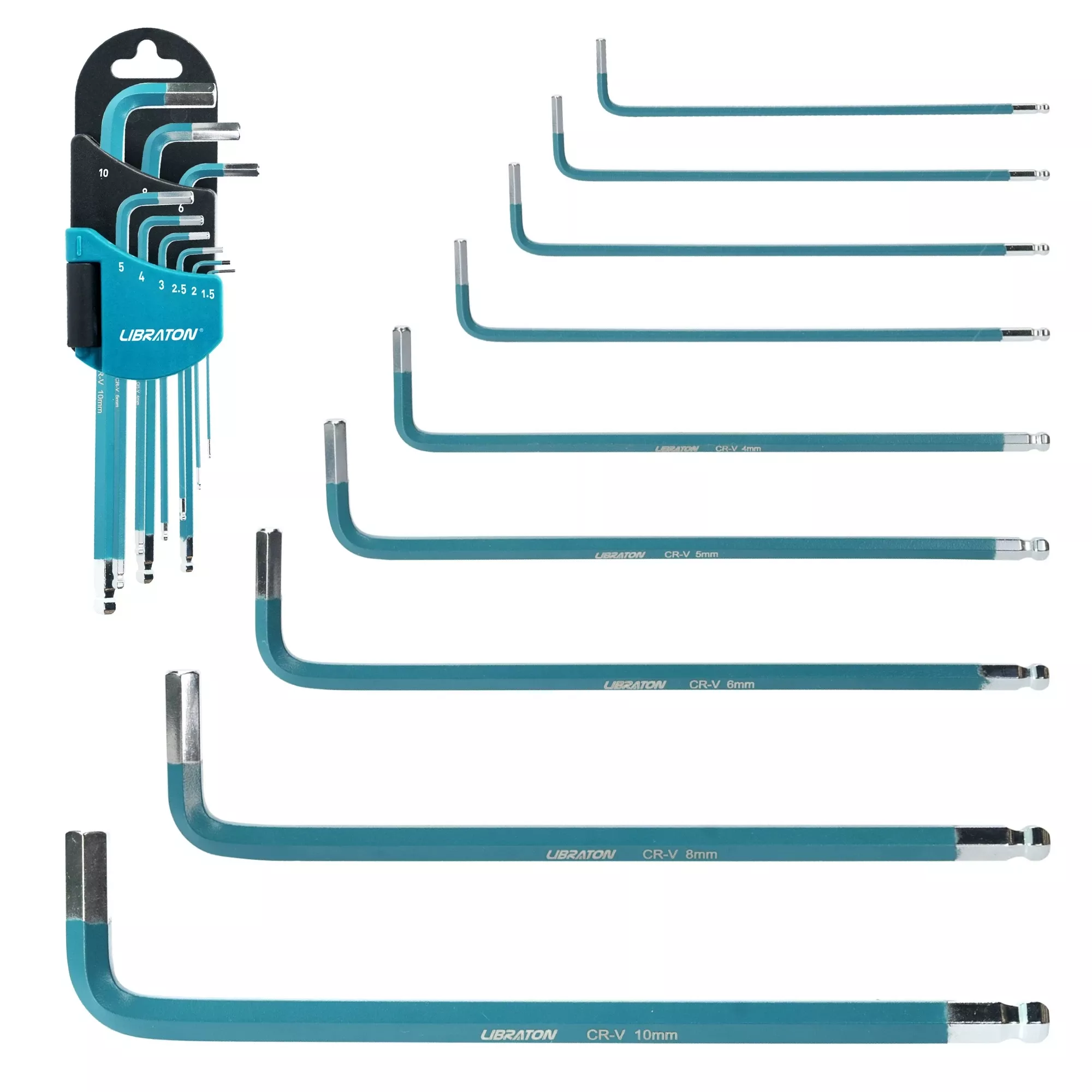 Crafted from high-quality CR-V steel, these hex keys deliver exceptional strength, wear resistance, and long-lasting performance. The polished finish makes cleaning off grease or grime simple, while the textured satin-plated surface ensures a secure, non-slip grip. Each key is neatly organized in a foldable hanging holder, keeping your tools tidy and ready to grab whenever you need them.