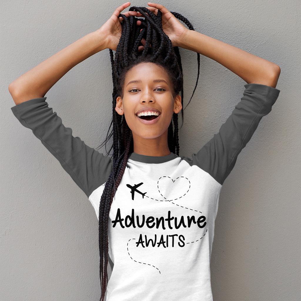 Adventure Awaits Plane Baseball T-Shirt – Airplane 3/4 Sleeve – Travelers Gift Raglan Jersey Shirt