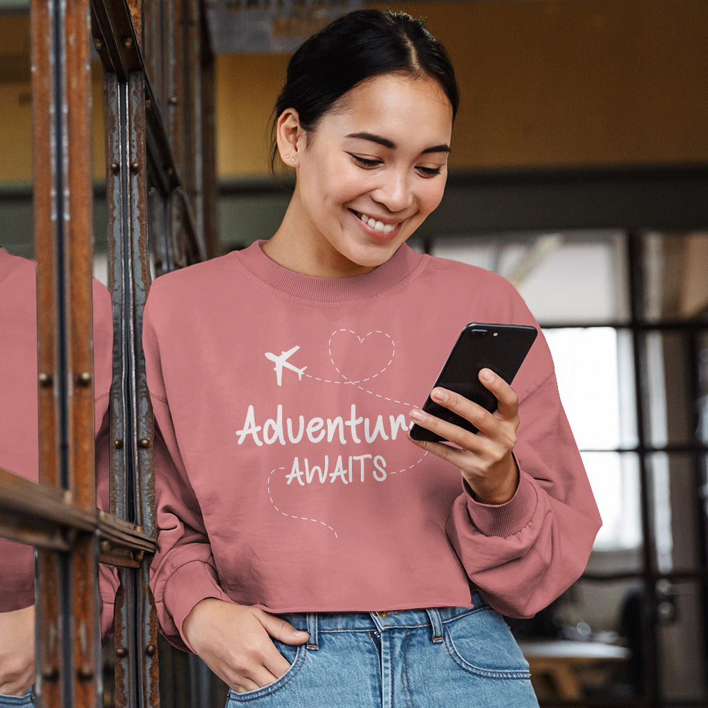 Adventure Awaits Plane Cropped Long Sleeve Sweatshirt – Airplane Women’s Crop Top – Travelers Gift Long Sleeves Pullover