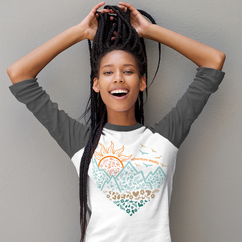 Adventure Awaits Sunrise Baseball T-Shirt – The Great Outdoors 3/4 Sleeve – Wanderlust Raglan Jersey Shirt