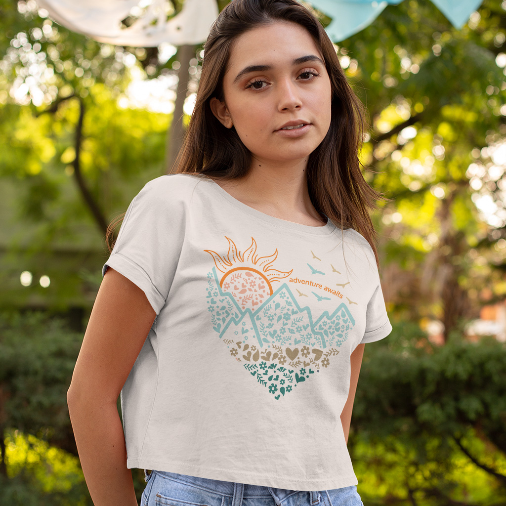 Adventure Awaits Sunrise Cropped T-Shirt - The Great Outdoors Trendy Tee - Wanderlust Women's Basic T-Shirt