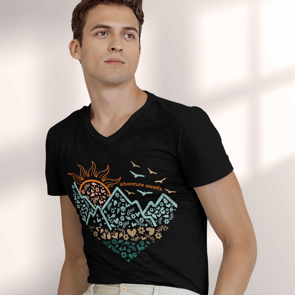 Adventure Awaits Sunrise V-Neck T-Shirt – The Great Outdoors Basic T-Shirt – Wanderlust Tee