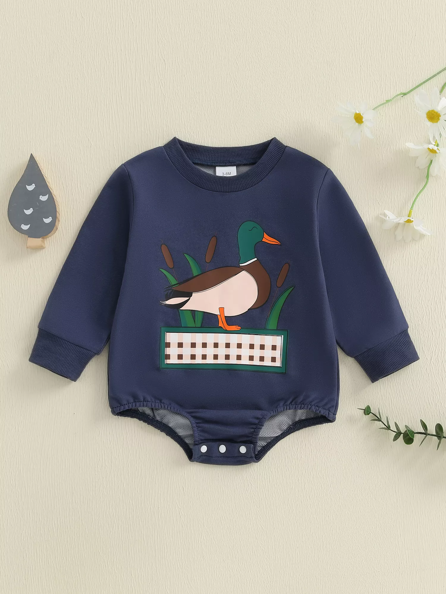 Dress your little one in this charming baby boy fall romper designed to keep him comfortable and stylish all day long. Featuring a playful duck print on a deep navy blue background, this loose-fit jumpsuit is perfect for those crisp autumn days. The soft cotton blend fabric gently hugs your baby’s delicate skin, while the long sleeves and crew neck offer extra warmth without restricting movement.
