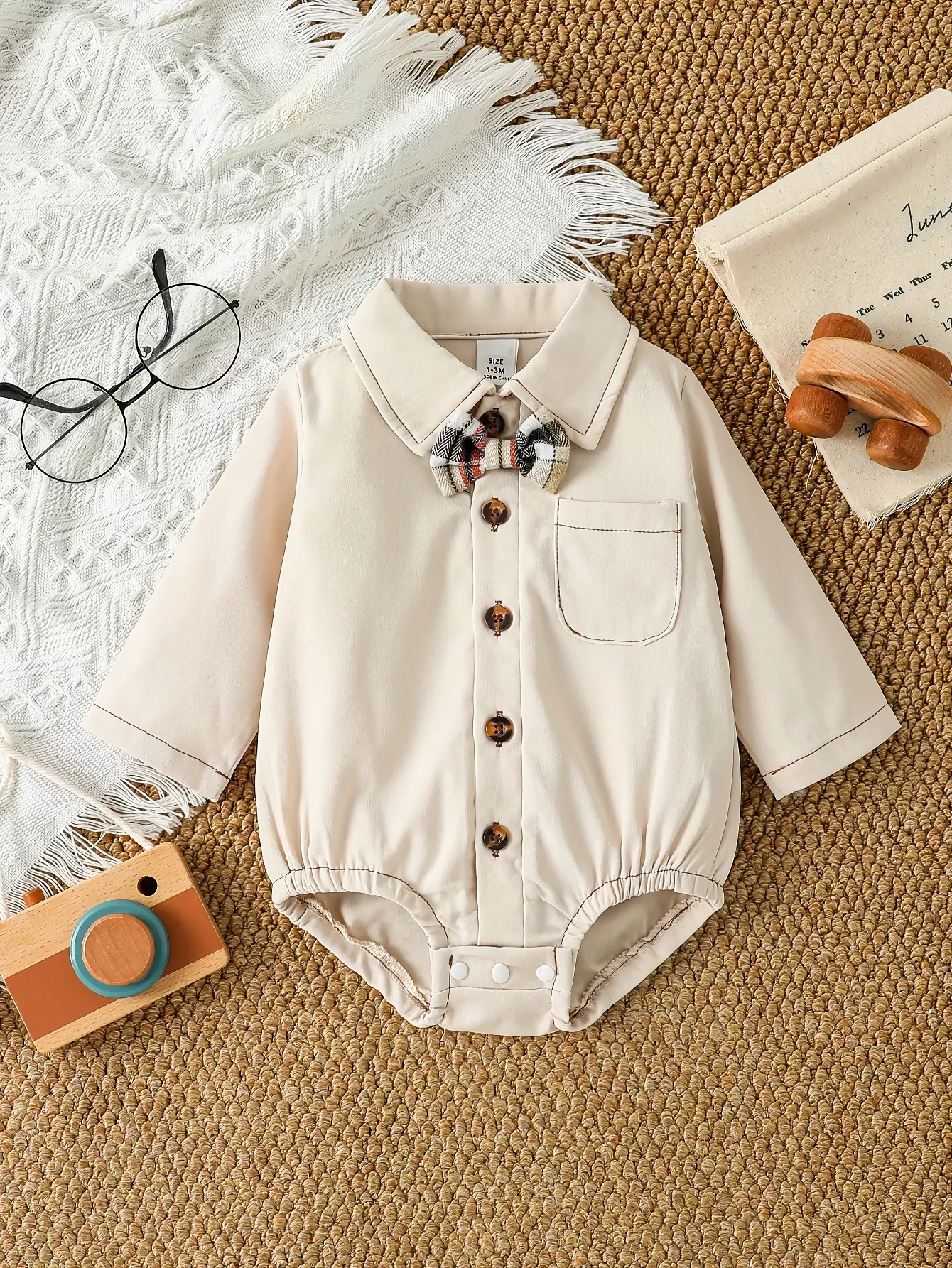 Unlike ordinary baby clothes, this romper captures a preppy, formal style without sacrificing comfort. The one-piece design means no need to coordinate separate tops and bottoms, while the high-quality stitching ensures it keeps its shape wash after wash. The built-in bowtie is securely attached, adding a playful yet sophisticated touch.