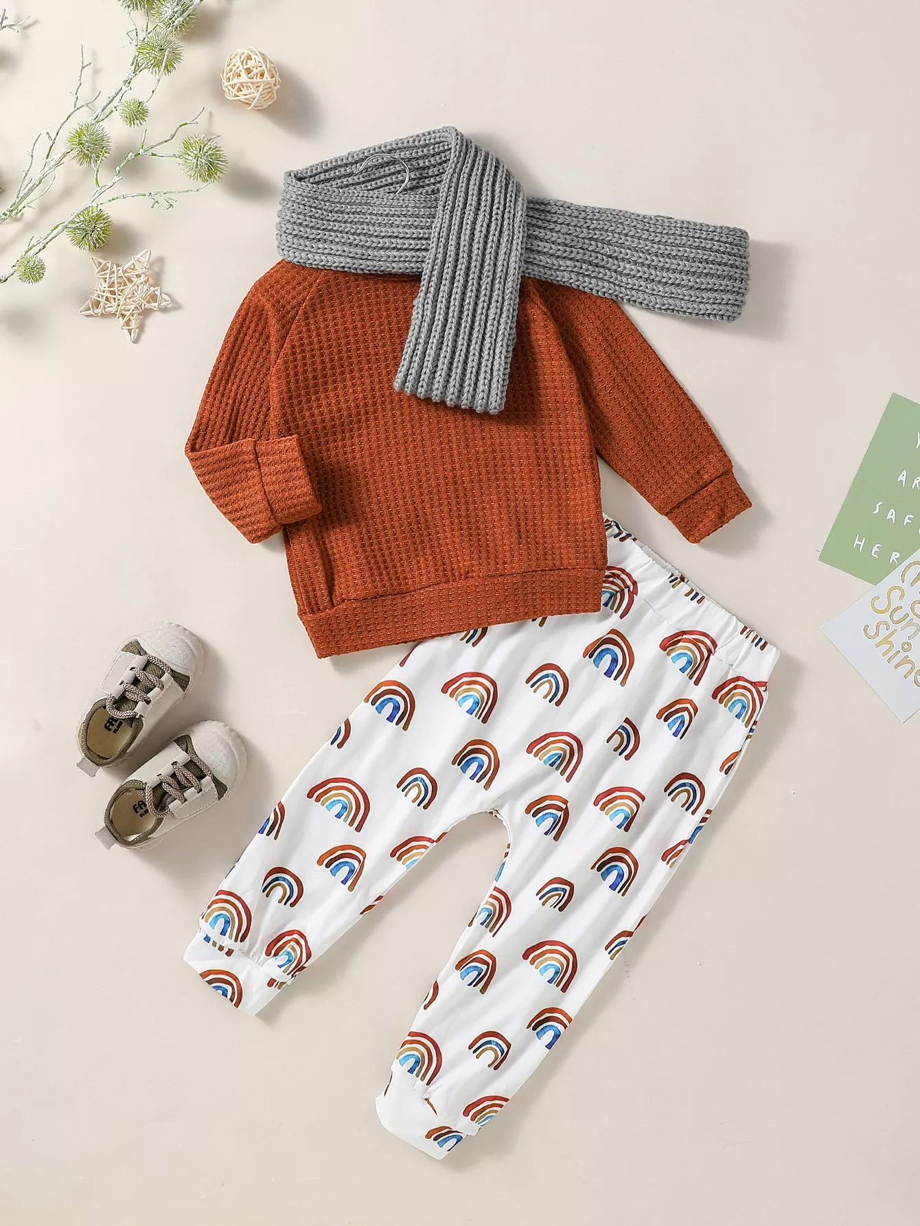 This isn’t just another toddler outfit – it’s a thoughtful blend of fashion and function. The minimalist solid top pairs perfectly with the vibrant rainbow print bottoms, giving you the flexibility to mix and match with other wardrobe pieces. The high-quality fabric blend ensures durability for active play, while the charming design makes it picture-perfect for family photos, holidays, or just brightening up everyday moments.