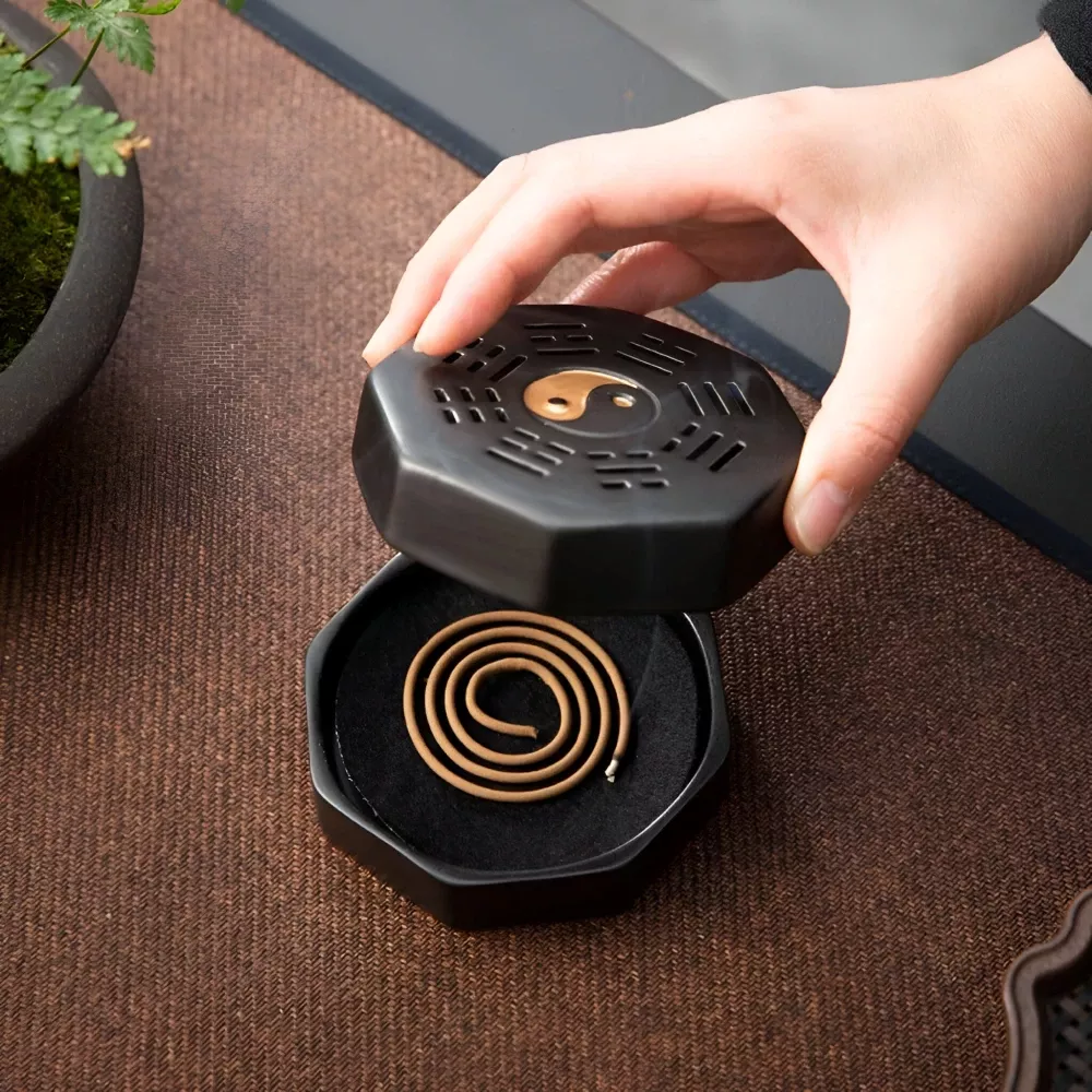 Discover the perfect blend of tradition and tranquility with this Black Glazed Eight Trigrams Sandalwood Coil Incense Holder. Crafted from high-quality ceramic, this sleek black incense burner is designed not only to enhance your home decor but also to elevate your senses. Its elegant Eight Trigrams design adds a touch of cultural mystique, making it a standout piece in any room.