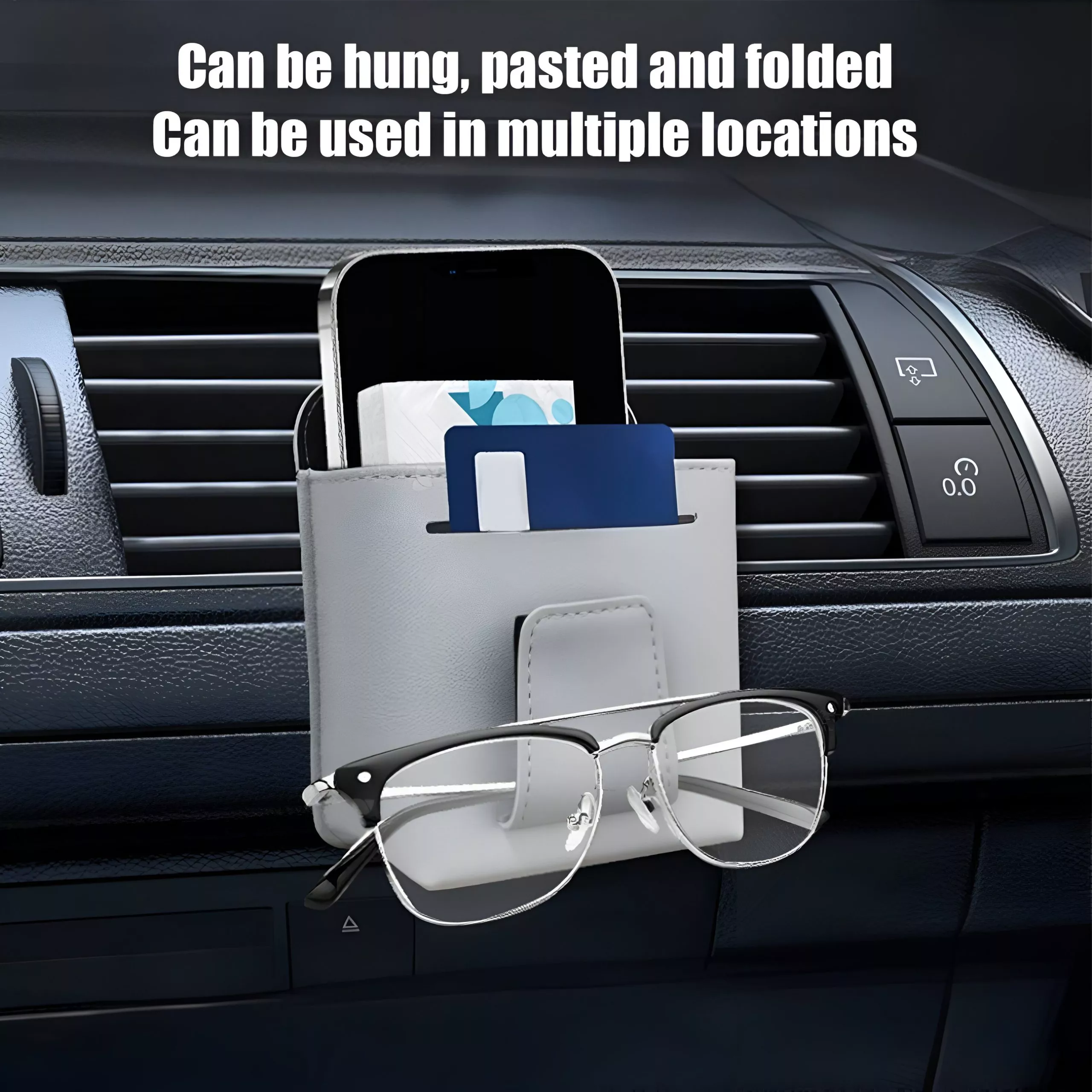 Unlike ordinary car organizers, this pouch combines multi-pocket storage with a dedicated sunglasses holder, offering quick access to your phone, wallet, coins, keys, and cards. The foldable and retractable design saves space, while the non-slip grip ensures your belongings stay put, even on bumpy roads. Its leather finish with matte metal accents makes it not just practical, but also a refined accessory for your dashboard.