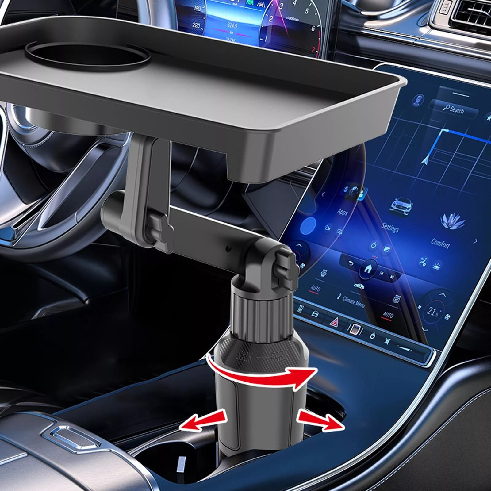 - Secure Multi-Direction Rotation – The adjustable base and two-way rotation ensure this tray fits snugly into multiple cup holder sizes, providing a wobble-free experience even on bumpy roads.