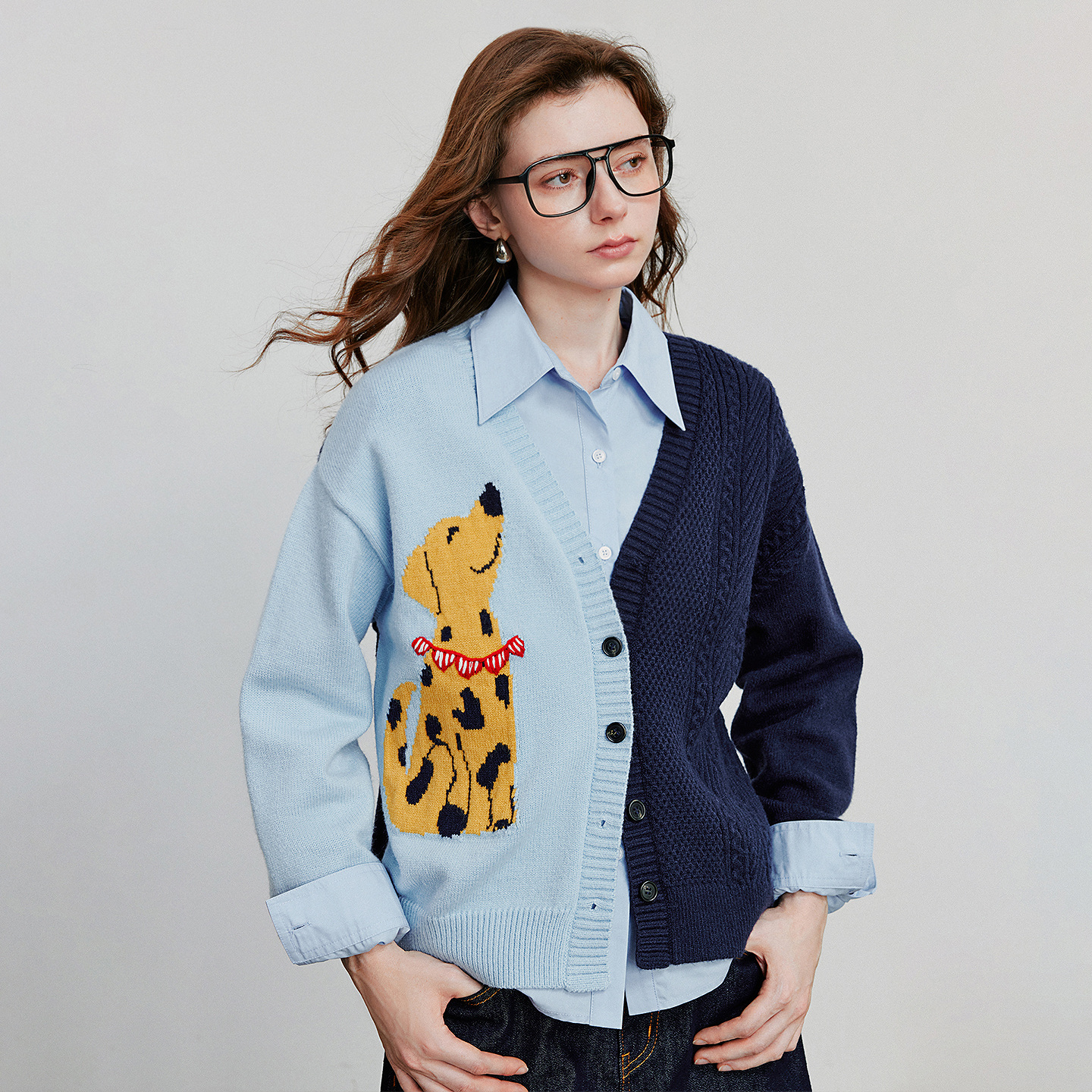 Embrace autumn fashion with our captivating Color-Contrasting Dog Jacquard V-Neck Cardigan. Designed for the modern woman, this stylish sweater combines warmth and creativity, making it an essential addition to your wardrobe. With its charming dog jacquard pattern and striking color contrast, this cardigan is perfect for those who want to make a fashion statement while staying cozy!