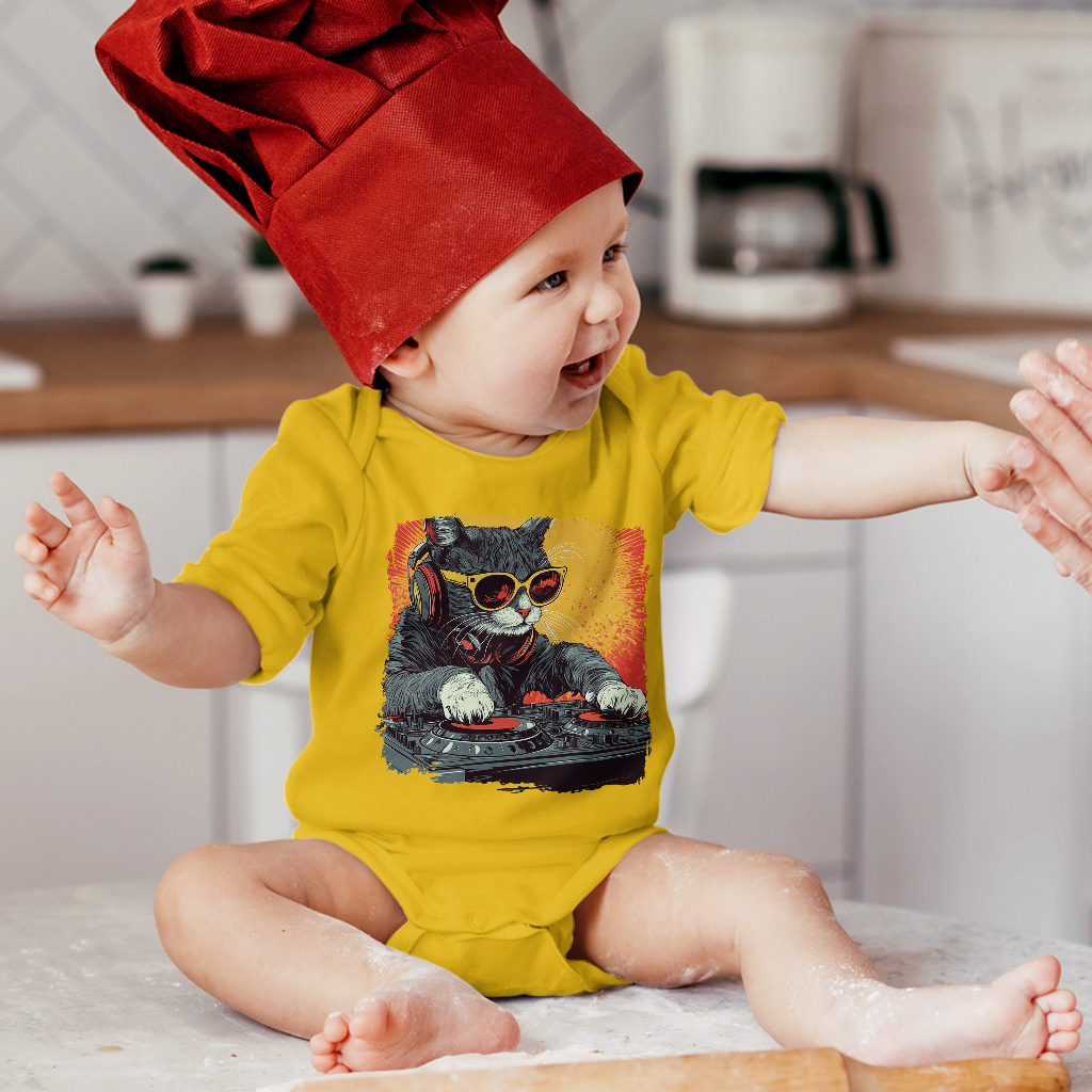 Cool DJ Cat Baby Onesie – Trendy Cat Graphic Baby Bodysuit – Music 90s Baby One-Piece
