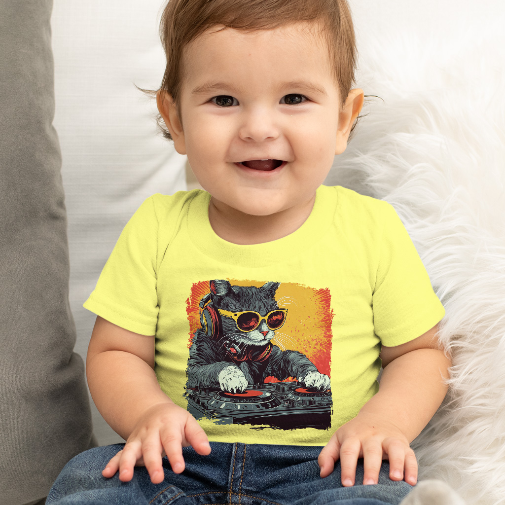 Cool DJ Cat Baby T-Shirt – Music 90s T-Shirt for Kids – Trendy Cat Graphic Short Sleeve Tee