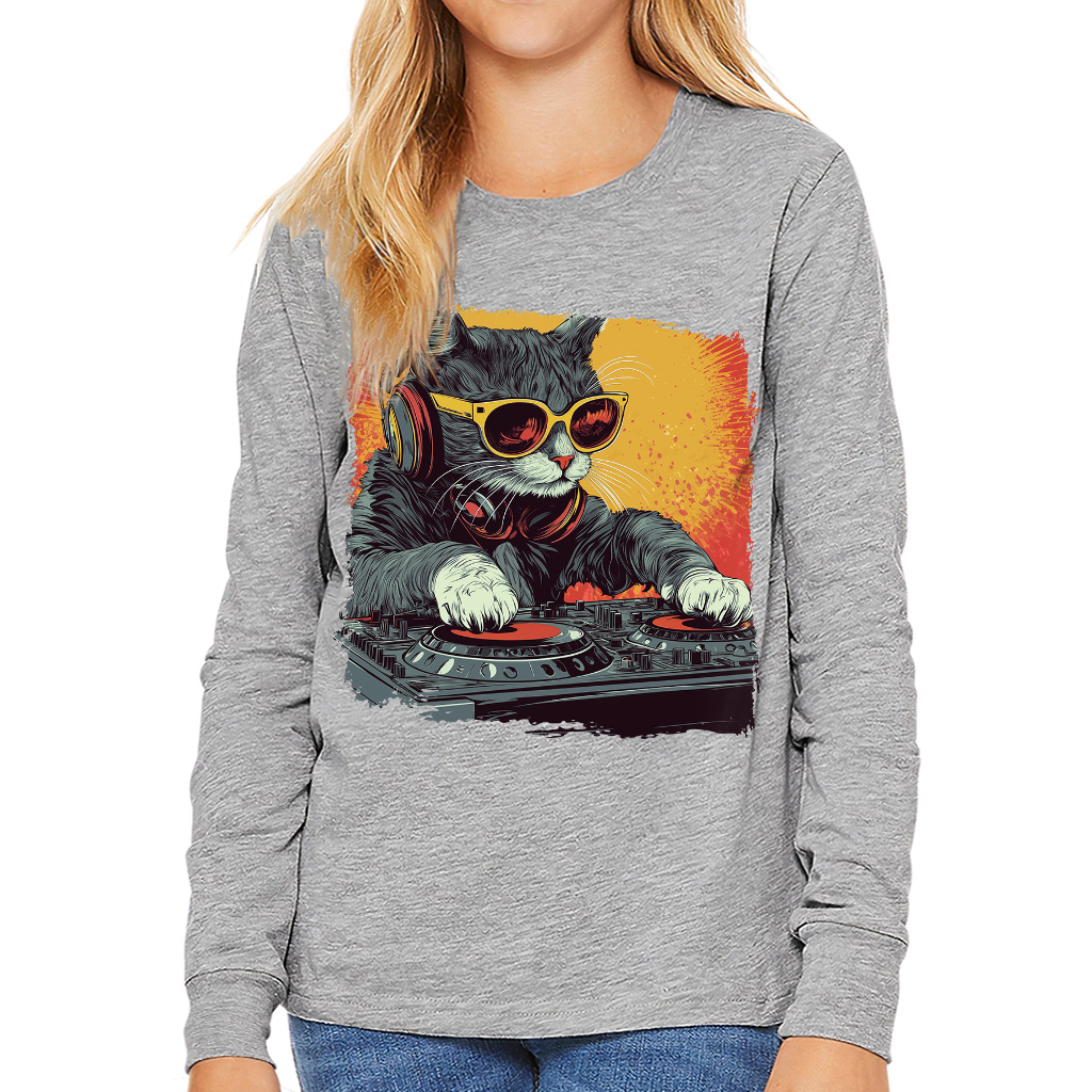 Cool DJ Cat Kids' Long Sleeve T-Shirt - Music 90s T-Shirt for Kids - Trendy Cat Graphic Tee for Boys Girls