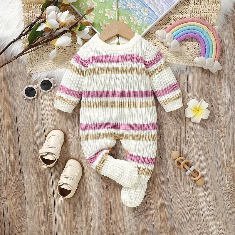 Wrap your baby in warmth and comfort with this adorable newborn baby romper. Crafted from soft acrylic knit, this jumpsuit is designed to keep your infant cozy during chilly autumn, spring, and winter days. Its long sleeves and foot-wrapped design ensure your baby stays snug from head to toe. Featuring a classic striped pattern and a comfortable pullover style with an easy O-neck, this romper is perfect for everyday wear.