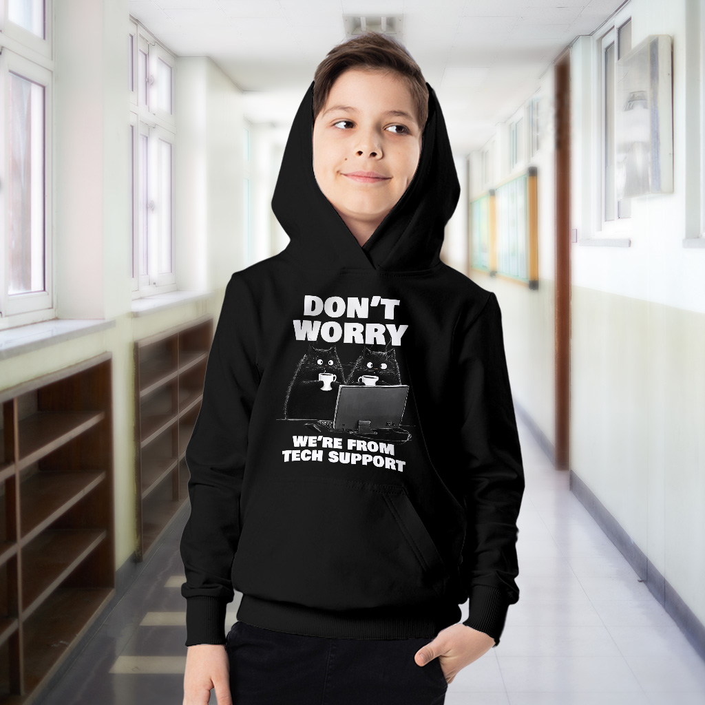 Don’t Worry We’re From Tech Support Kids’ Hoodie – Cool Cat Hooded Sweatshirt – Funny Gift Hoodie for Kids