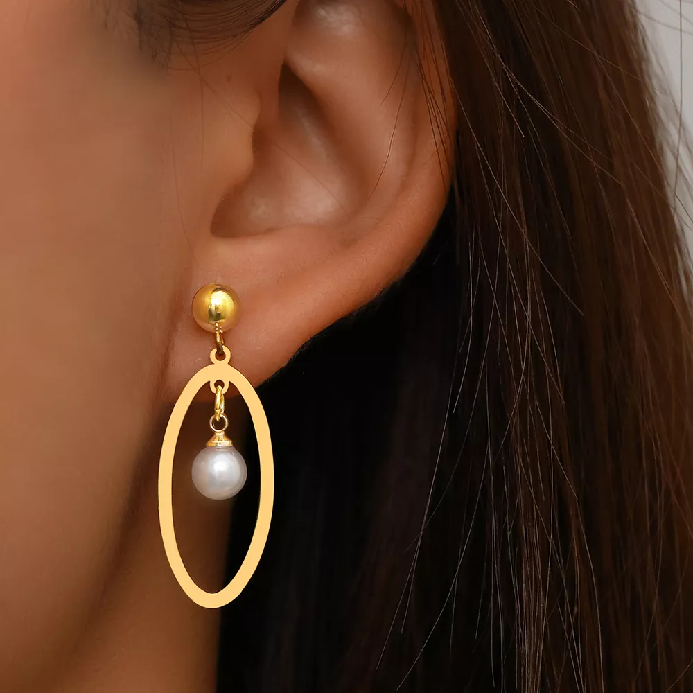 These stunning gold-plated stainless steel pearl drop earrings combine simplicity and elegance in one captivating design. Featuring a geometric hollow oval shape paired with a lustrous imitation pearl, they are the perfect statement piece to elevate any outfit. The sleek gold finish ensures a luxurious touch, while the stainless steel base guarantees long-lasting beauty without fading.