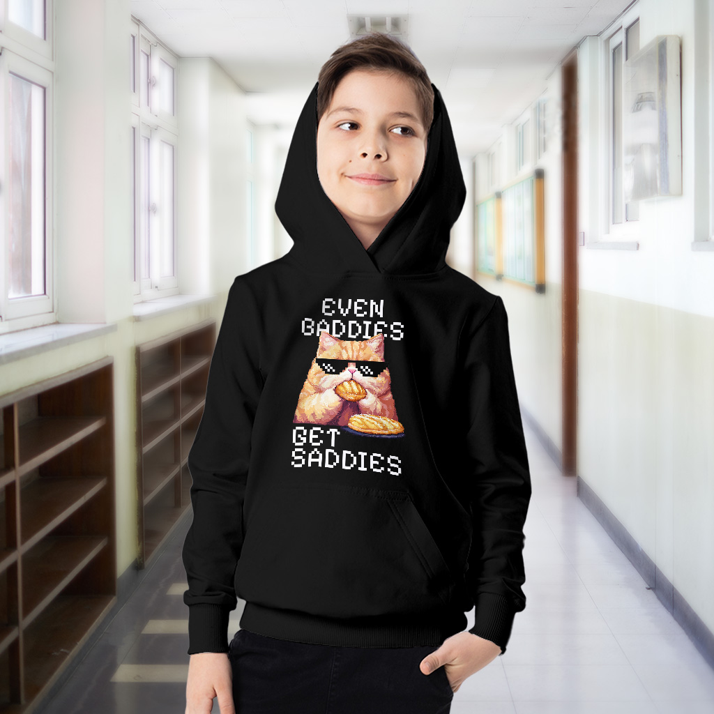 Even Baddies Get Saddies Kids’ Hoodie – Cat Meme Hooded Sweatshirt – Cat Lover Hoodie for Kids