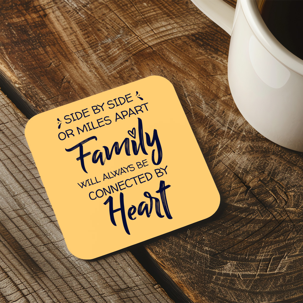 Family Will Always Be Connected by Heart Square Coaster 4-Piece Set - Family Inspirational Coasters for Drinks - Funny Family Coffee Tea Mug Coasters