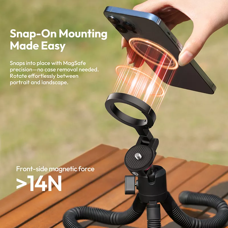 - Snap-On MagSafe Mount – Securely attach iPhones without removing the case and rotate between portrait and landscape modes.