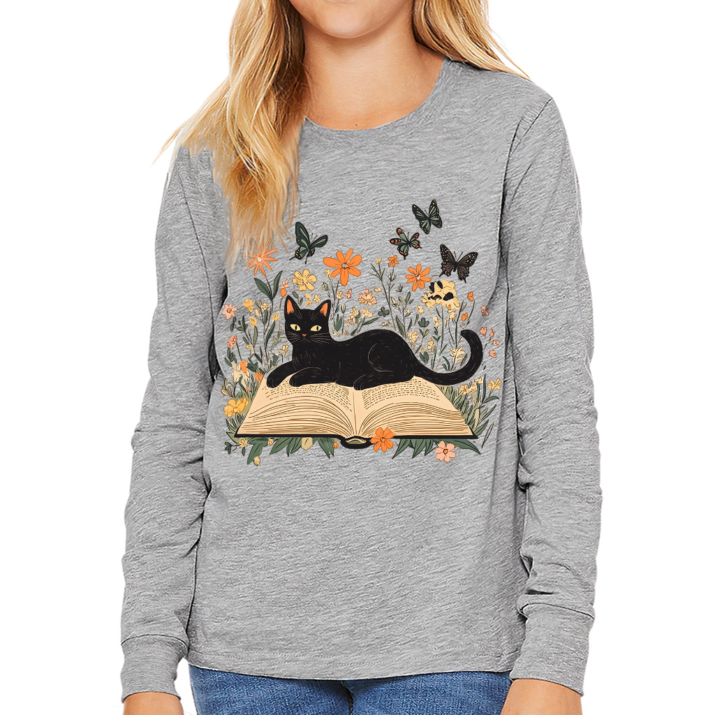 Floral Cat Kids’ Long Sleeve T-Shirt – Cute Cat T-Shirt for Kids – Cat Book Tee for Boys Girls