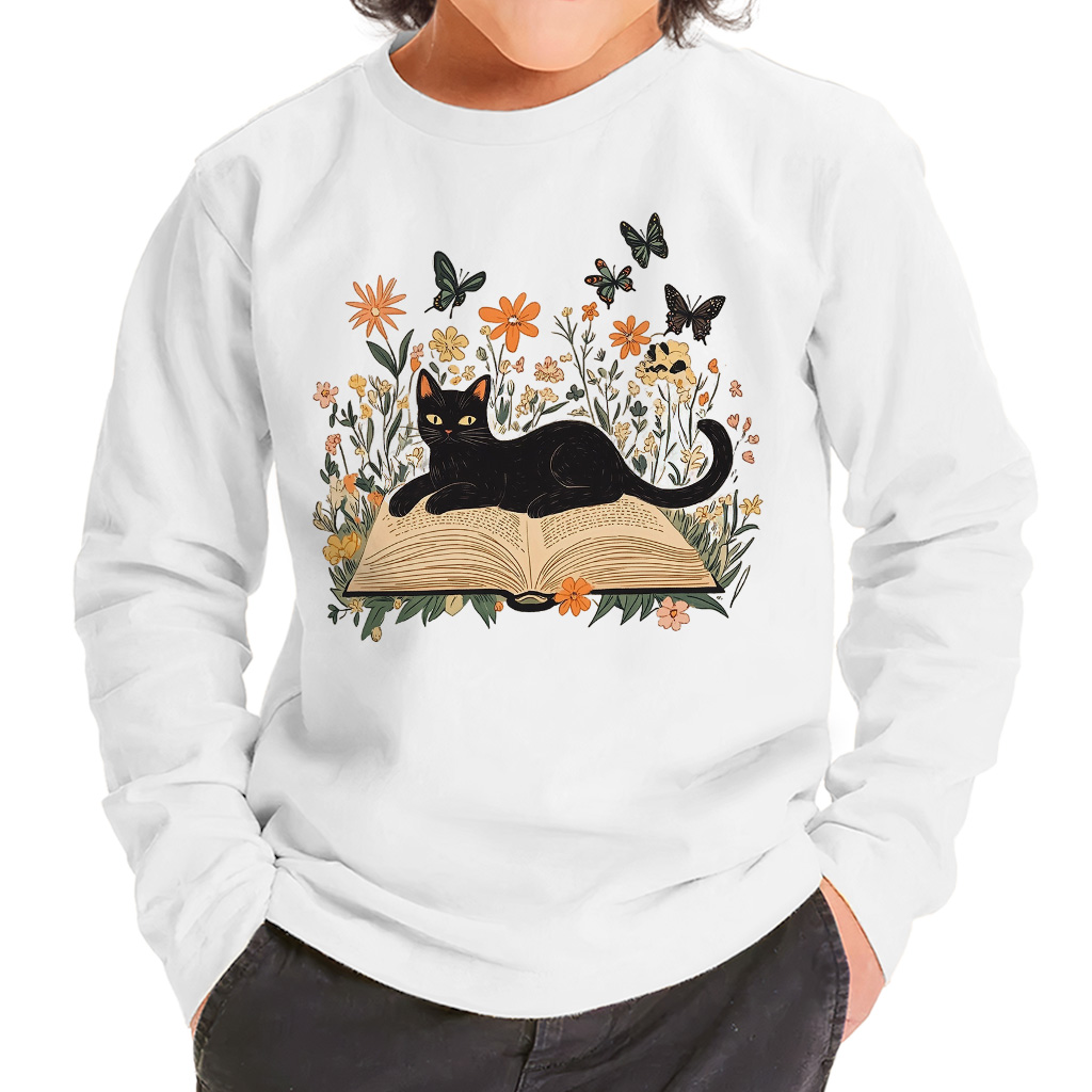 Floral Cat Toddler Long Sleeve T-Shirt - Cute Cat Boy Girl Tee - Cat Book T-Shirt for Kids