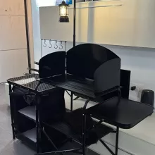 Bring the convenience of a full kitchen to your campsite with this versatile folding camping kitchen table. Designed for campers, RV travelers, backyard chefs, and outdoor enthusiasts, this portable cook station lets you organize, cook, and serve with ease. The spacious layout includes a sturdy aluminum main table, side tables, a steel grill shelf, and roomy zippered storage compartments — giving you all the space you need for ingredients, utensils, and cookware.