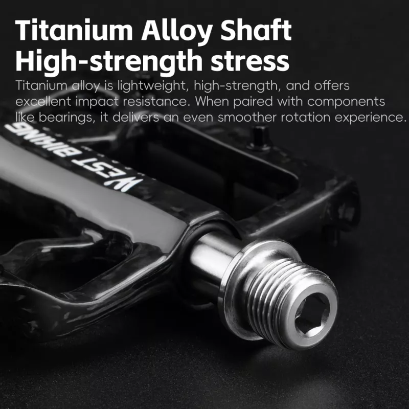 Take your cycling experience to the next level with these ultralight flat bike pedals, designed for riders who demand both strength and precision. Built with a full carbon fiber body and a titanium alloy shaft, these pedals deliver outstanding durability while keeping weight to a minimum. At just 3.17 oz each, they provide a responsive feel that enhances speed and control without adding bulk to your bike.