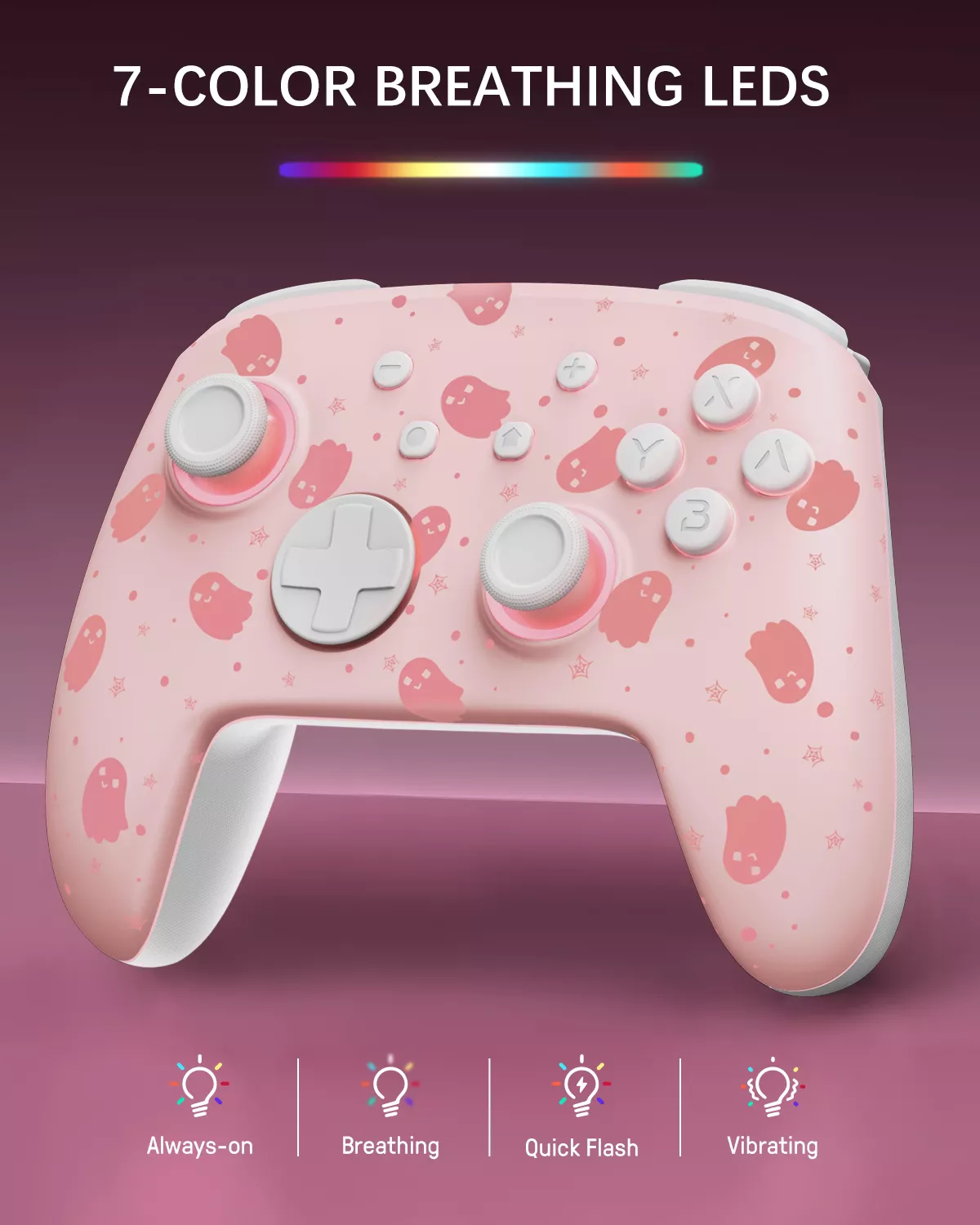 Take your gaming sessions to the next level with the Halloween Ghost Pink Luminous Pro Controller. Designed for Nintendo Switch, Switch OLED, Switch Lite, Switch 2, and PC, this advanced controller combines stunning visuals with precision performance. Featuring a hidden ghost pattern that glows to life only when the LEDs are active, it transforms your play into a glowing, immersive experience. Perfect for Halloween vibes or anytime you want your setup to shine.