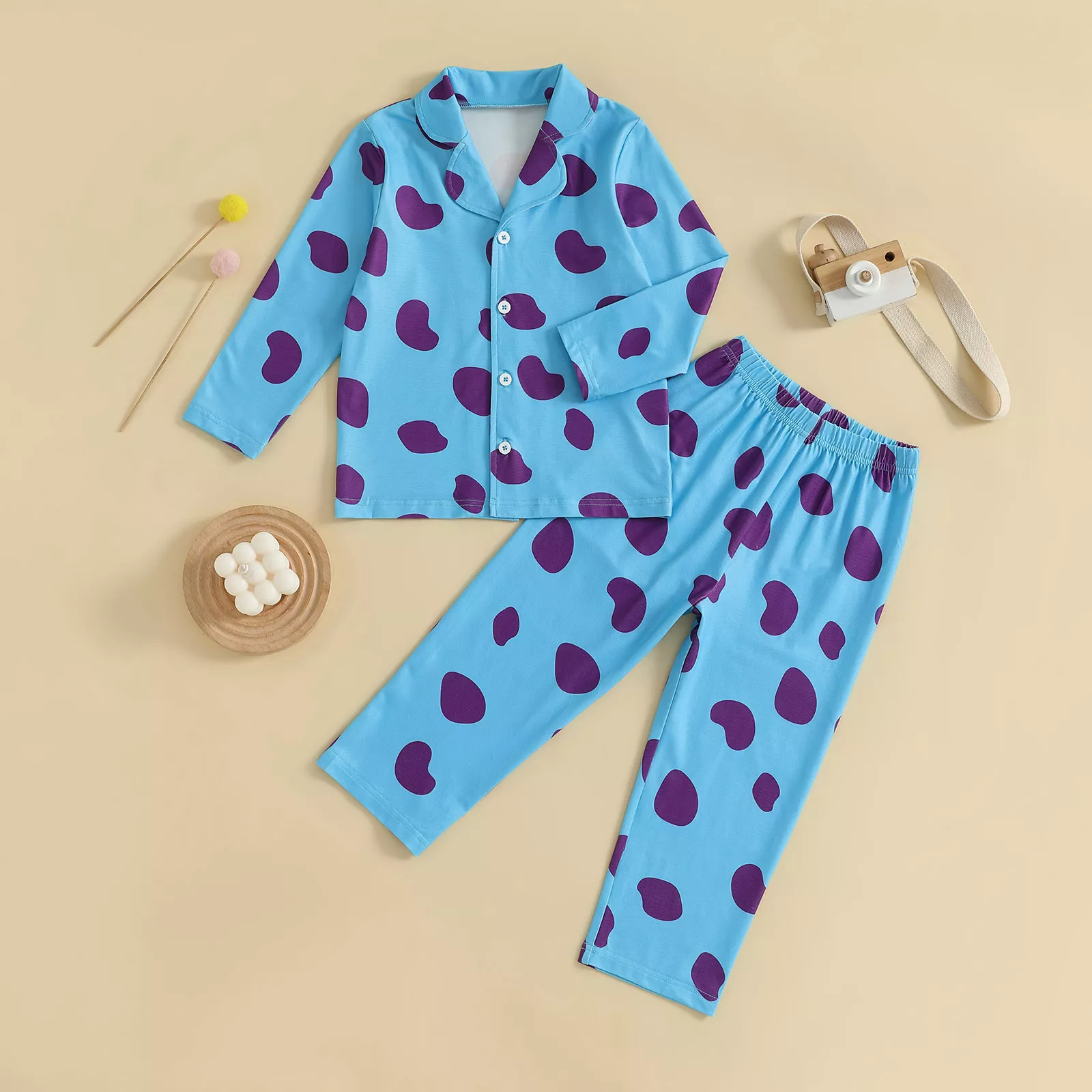 Make bedtime and lounging extra fun with this adorable kids pajama set. Designed with a cute graphic print and a unisex style, this two-piece outfit blends comfort and fashion for boys and girls alike. The set includes a long-sleeved button-up shirt with a classic lapel collar and a pair of pants with a soft, elastic waistband for the perfect fit. Lightweight yet cozy, it’s crafted from a blend of polyester and spandex that feels gentle on your child’s skin, ensuring they stay comfortable all night long.