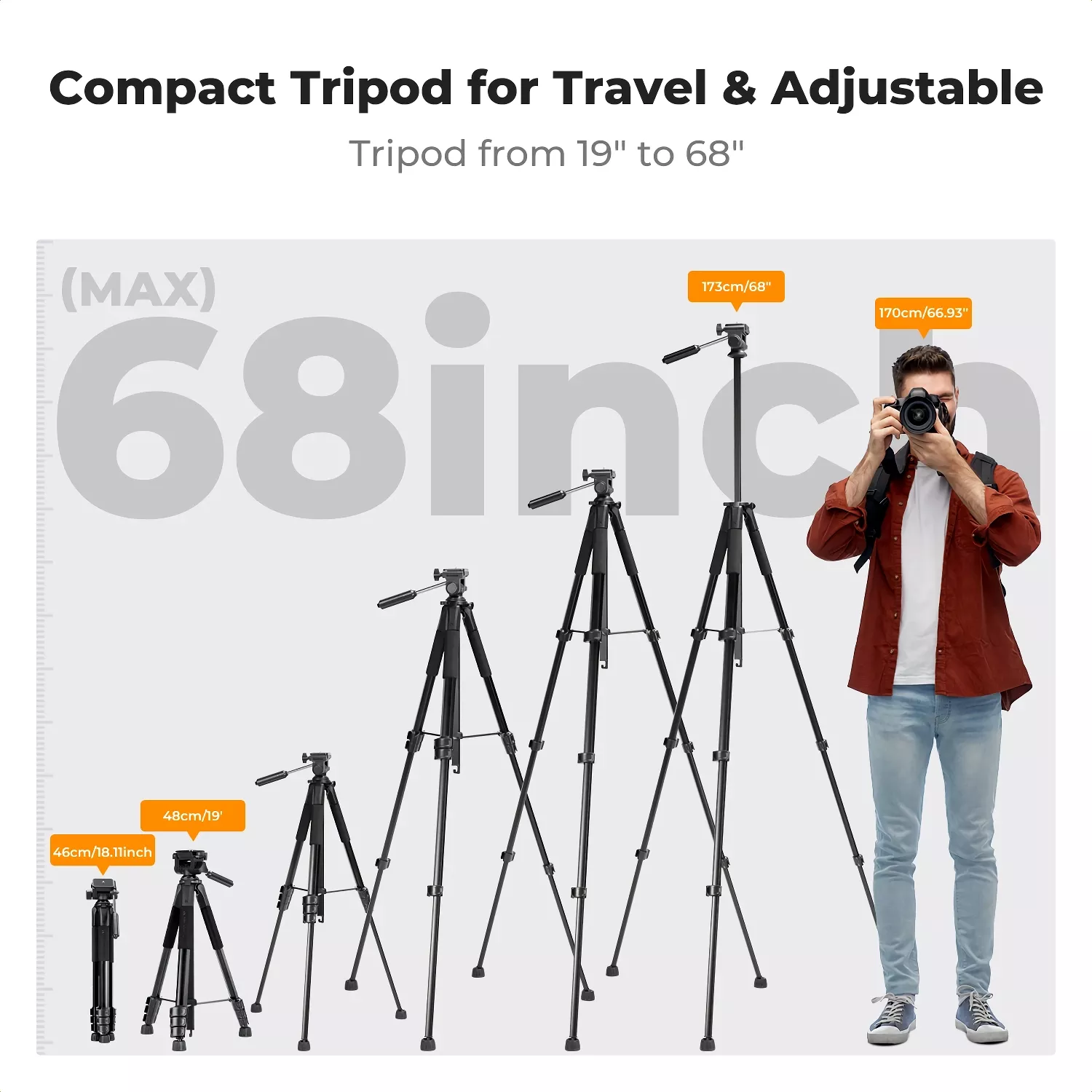 This tripod adjusts effortlessly from 19″ to a towering 68″, making it ideal for capturing landscapes, portraits, or overhead shots. Whether you’re using a DSLR camera, smartphone, projector, webcam, or ring light, its heavy-duty build supports up to 9 lbs with ease. The 360° horizontal rotation and tilt angles from +100° to -70° give you complete creative freedom for multi-angle shooting.