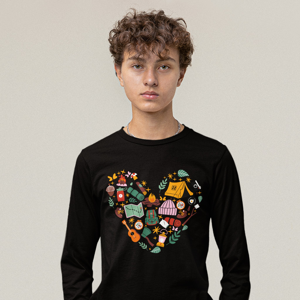 Love Camping Long Sleeve T-Shirt – Cute Heart T-Shirt – Camp Fire Basic Tee