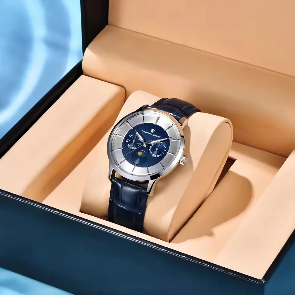 - Stylish Detailing: Minimalist dial with moon phase display for added elegance