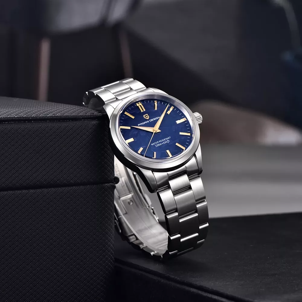 With a high-precision quartz movement, you’ll enjoy accurate timekeeping without compromise. The sapphire crystal dial window offers exceptional scratch resistance, keeping your watch looking new for years. Built with shock resistance and 10-bar water resistance (up to 330 feet), it’s perfect for both everyday wear and light water activities like swimming or snorkeling. The folding clasp with safety ensures a secure and comfortable fit, while the polished stainless steel band adds a touch of luxury to any outfit.