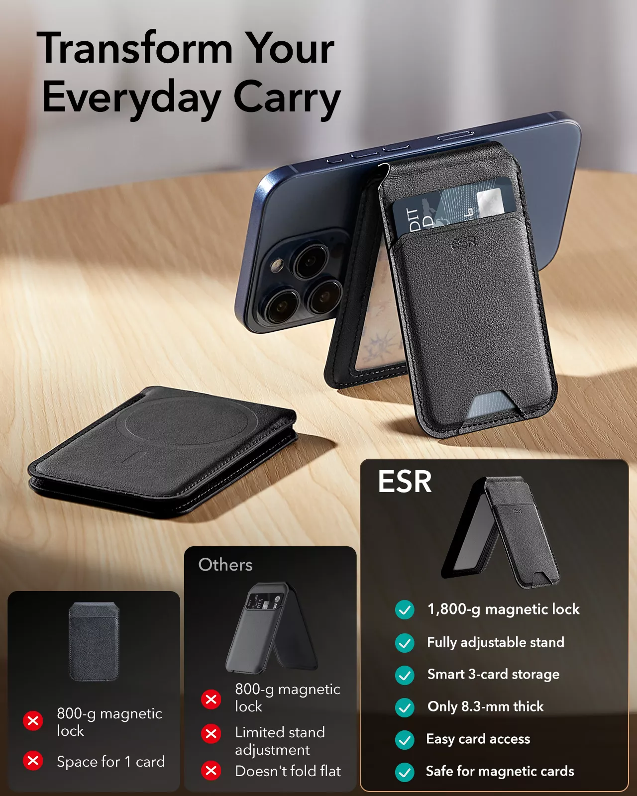 No more bulky pockets or juggling between phone and wallet. This slim, pocket-friendly design combines three essentials into one: a secure magnetic wallet, a stable stand, and a stylish accessory. Whether you’re on the go, working, or relaxing, you’ll always have everything you need in one place.