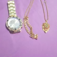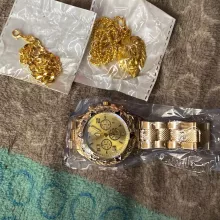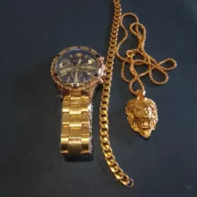 What a fantastic find! I've been on the lookout for something like this for quite some time. The watch, bracelet, and necklace combo is just perfect – each piece complements the other beautifully. It's clear that they're all made from durable alloy because even after daily use, they still look as polished and shiny as when I first got them. The quartz movement of the watch has proven to be incredibly reliable too; it keeps accurate time without needing much maintenance at all. Plus, the bold design really stands out – whether I'm in a business meeting or out on a date night with my wife. All in all, an excellent purchase.