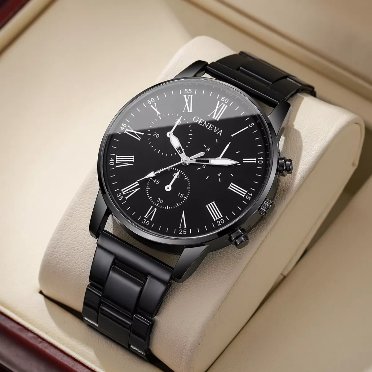 This watch is more than just a timepiece – it’s a statement. The polished black case paired with a sleek metal band delivers a look that’s both refined and versatile. The lightweight feel ensures comfort during long days, while the bold face draws just enough attention to make it a conversation starter. Whether you’re in a boardroom or at a dinner party, it complements your attire effortlessly.