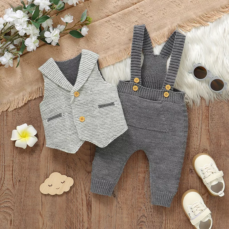 Dress your baby boy in timeless elegance with this adorable 2-piece knitted outfit, featuring a sleeveless vest and matching romper. Designed for infants from newborn up to 18 months, this set blends comfort, style, and practicality, making it the perfect choice for special occasions, family gatherings, or simply when you want your little one to look extra charming.