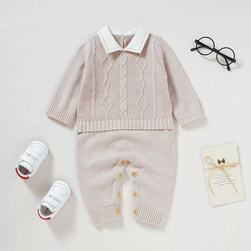 Wrap your little one in pure comfort with this 100% cotton knit newborn romper. Designed for infants and toddlers from 0 to 12 months, this one-piece outfit brings together cozy softness and timeless style. The breathable knit fabric keeps your baby comfortable all day, while the gentle stretch allows freedom of movement during play, naps, and snuggles. Its solid color and classic turn-down collar make it a perfect choice for both casual days at home and special outings.