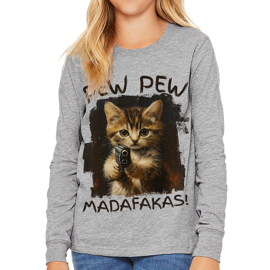 Pew Pew Madafakas Kids’ Long Sleeve T-Shirt – Funny Kitten T-Shirt for Kids – Cat Lover Tee for Boys Girls