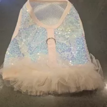 What a joy to finally find such an adorable yet practical pet accessory! The mermaid-inspired sequin design is eye-catching, while the fluffy mesh material ensures comfort. I love how easily adjustable it is for my little pup's size, with straps that can be tailored to fit both his neck and chest perfectly. It even includes a matching leash which makes our walks so much more convenient!