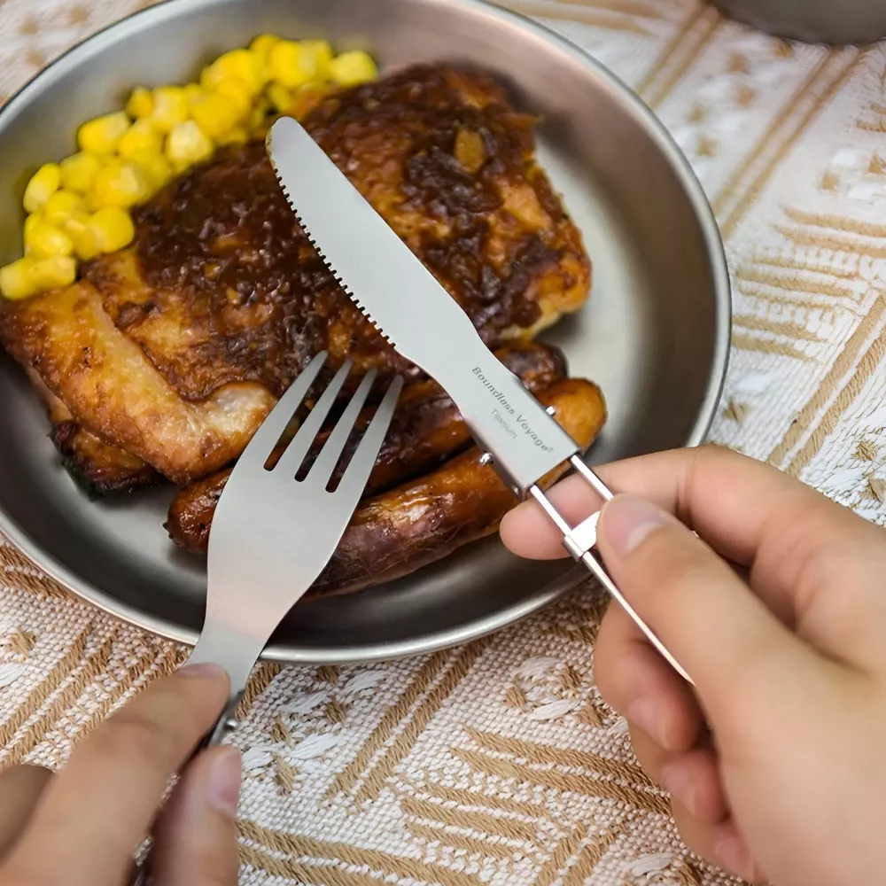 Enjoy the freedom of eating anywhere with this premium titanium camping cutlery set. Designed for adventurers, travelers, and anyone on the go, this set combines durability, portability, and functionality in a sleek, folding design. Crafted from 99.8% pure titanium with stainless steel handles, each piece is lightweight yet incredibly strong, resisting rust, corrosion, and daily wear. From a hearty camping breakfast to a simple office lunch, this set makes every meal effortless.