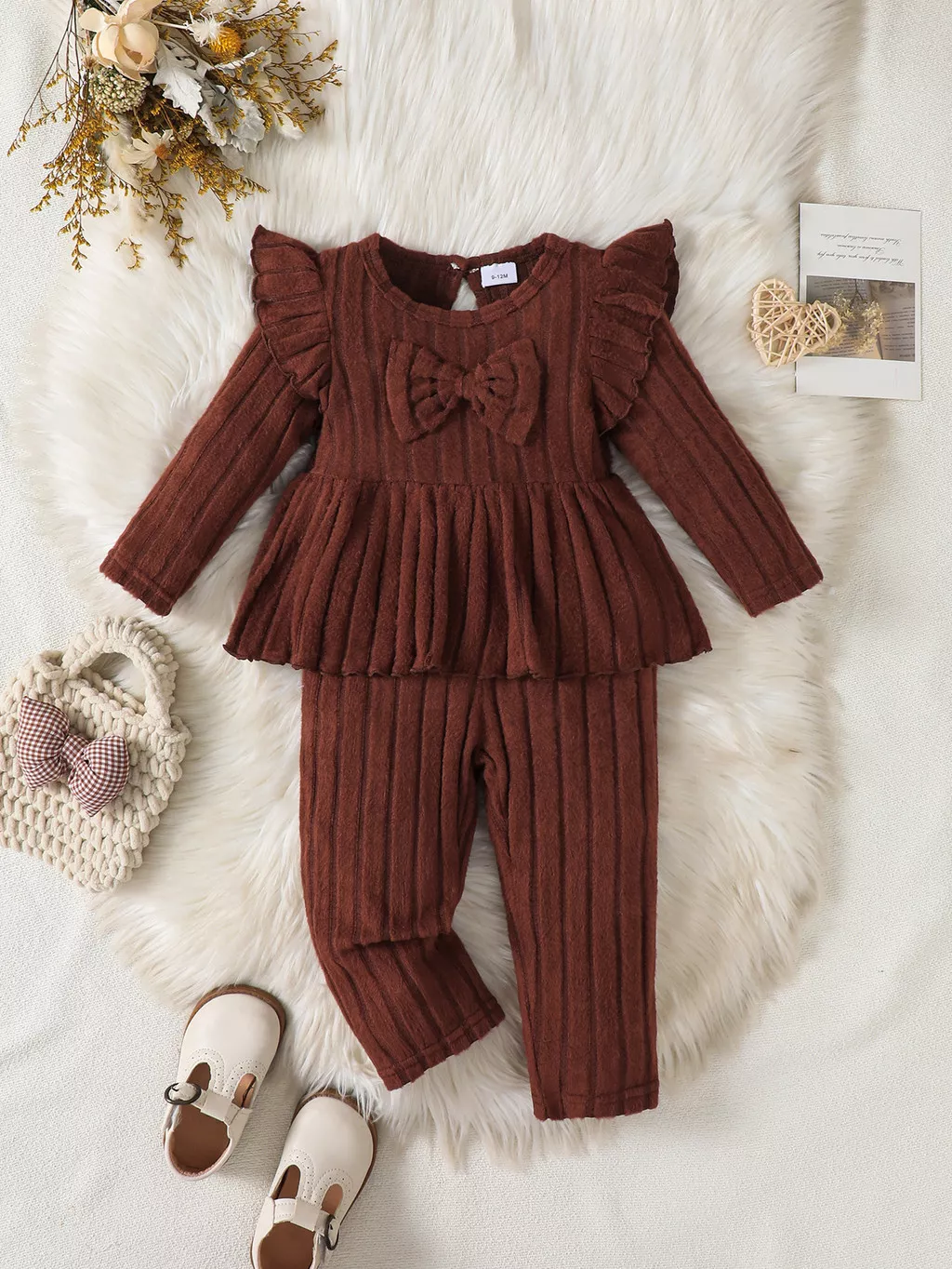 Dress your little one in cozy elegance with this 2-piece toddler girl autumn outfit, designed to keep her comfortable while looking irresistibly cute. The set features a soft, long-sleeved top with a charming bow accent and matching pants, blending a gentle Korean-style design with everyday practicality. Crafted from a breathable polyester-spandex blend, it offers the perfect balance of softness, stretch, and durability, making it an ideal choice for active toddlers aged 0–3 years.