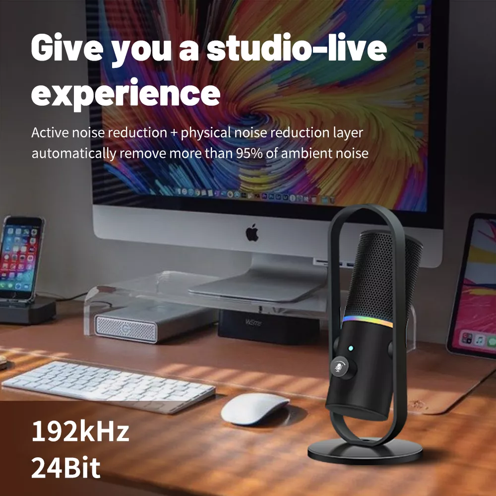 Equipped with customizable RGB lighting, this microphone adds a dynamic and stylish touch to your desktop setup. The shockproof bracket and rotating stand reduce vibrations and desk noise, providing smoother recordings. The built-in 3.5mm headphone jack allows delay-free monitoring, and the gain adjustment and mute functions give you full control over your audio in real time. With high-resolution 24-bit/192kHz output, your recordings are crisp, detailed, and professional.