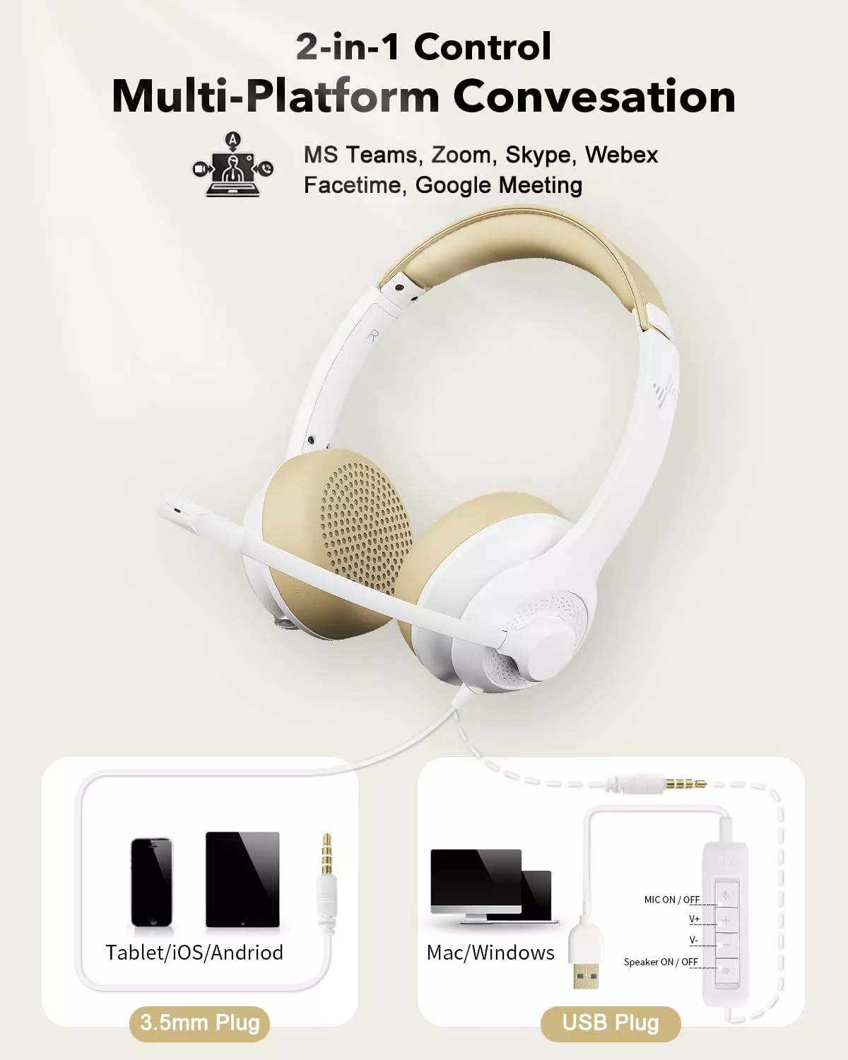 Enjoy flexible use with dual connection options. Plug into your PC, laptop, or Mac via USB for convenient in-line controls, or use the 3.5mm audio jack to connect with tablets, smartphones, and other devices. The in-line control system gives you quick access to volume adjustment, mic mute, and speaker mute, ensuring smooth communication at your fingertips.